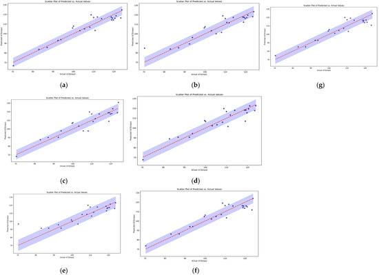 Figure 5 provides a comparative analysis of the scatter plots illustrating the relationship between predicted and actual UCS values using different modelling techniques. Each subplot displays a series of points representing the actual UCS values on the x-axis and the corresponding predicted UCS values on the y-axis, along with a red dashed line indicating the ideal 1:1 prediction line and a shaded region representing prediction uncertainty. As shown in Figure 5a, the Linear Regression model shows a broad distribution of points around the ideal line, indicating a moderate fit with noticeable variance, particularly for higher UCS values. As depicted in Figure 5b, the Random Forest model demonstrates an improved alignment with the 1:1 line, suggesting better prediction accuracy and less dispersion compared to Linear Regression. As illustrated in Figure 5c,d, the Gradient Boosting and XGBoost (d) models exhibit a closer clustering of points around the ideal prediction line, signifying higher predictive precision and reduced variability. This observation highlights the effectiveness of ensemble techniques in capturing the underlying patterns in the data. Similarly, as shown in Figure 5e, LightGBM also shows a strong correlation between predicted and actual values, though with slightly more dispersion compared to Gradient Boosting and XGBoost. Furthermore, The SVM-SVR model (see Figure 5f) presents a robust performance, with most points lying near the ideal line and within the uncertainty bounds. However, there are a few outliers that deviate significantly, indicating some limitations in the model’s generalization capability. Lastly, the MLP-ANN model (see Figure 5g) demonstrates a satisfactory predictive performance with a majority of points closely following the ideal line. Nonetheless, there is a slight tendency for higher variability at the extremes of the UCS range, suggesting that while MLP-ANN captures the overall trend effectively, it may struggle with extreme values.
