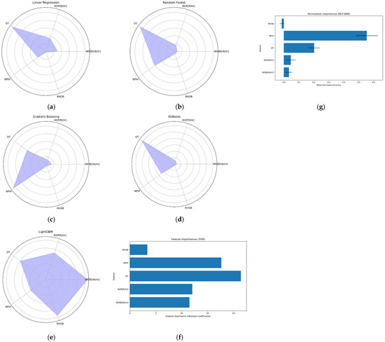 Comparison between the relative importance of the inputs for each model. (a) Linear Regression, (b) Random Forest, (c) Gradient Boosting, (d) XGBoost, (e) LightGBM, (f) SVM-SVR, and (g) MLP-ANN.