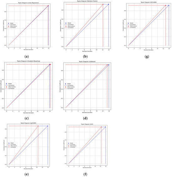 Comparison between the Taylor plot for each model. (a) Linear Regression, (b) Random Forest, (c) Gradient Boosting, (d) XGBoost, (e) LightGBM, (f) SVM-SVR, and (g) MLP-ANN.