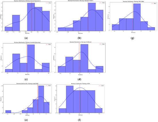 Comparison between the residual distribution of each model. (a) Linear Regression, (b) Random Forest, (c) Gradient Boosting, (d) XGBoost, (e) LightGBM, (f) SVM-SVR, and (g) MLP-ANN.
