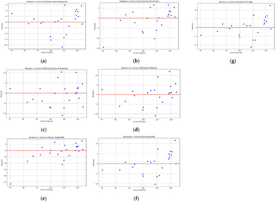 Comparison between the residuals of each model versus the actual UCS values. (a) Linear Regression, (b) Random Forest, (c) Gradient Boosting, (d) XGBoost, (e) LightGBM, (f) SVM-SVR, and (g) MLP-ANN.