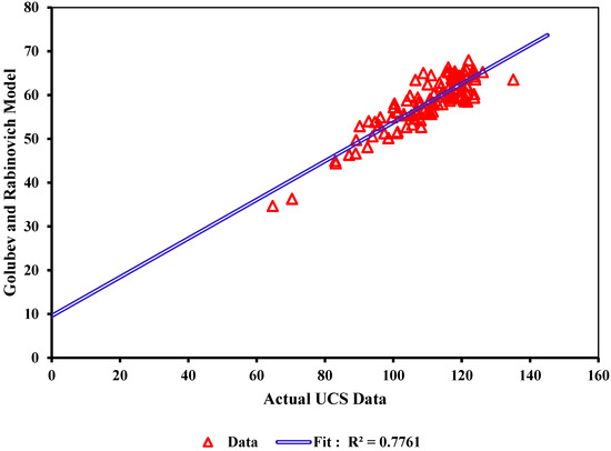 Scatter plot of estimated and measured UCS via the Golubev and Rabinovich model [9].