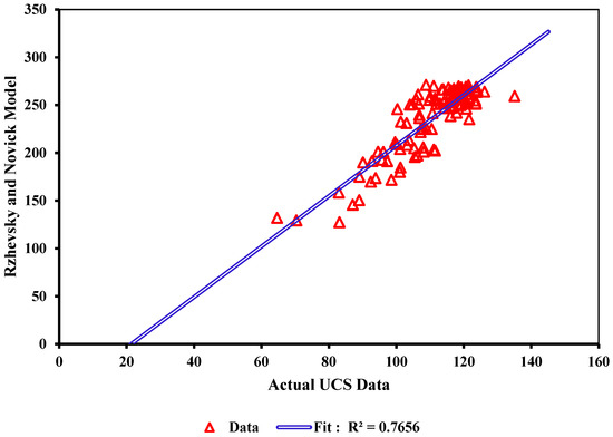 Figure 11 illustrates the comparison between real UCS data and the estimates produced by the Rzhevsky and Novick [41] model. The coefficient of determination, R2, is 0.7656, signifying that the model accounts for approximately 76.56% of the variability in the UCS data. This R2 value suggests that the Rzhevsky and Novick [41] model is a moderate predictor of UCS. Nonetheless, the dispersion of data points around the regression line points to some discrepancies and outliers, potentially arising from inherent model limitations.