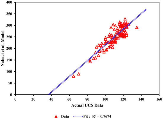Figure 12 presents a comparative analysis of the measured UCS data against predictions made by Nabaei et al.’s [10] model. The R2 value of 0.7674 suggests a moderately positive correlation between the model’s predictions and the actual UCS values. However, some scatter around the line indicates that while the model captures the general trend of the data, there are discrepancies and potential outliers that could be attributed to variances in measurement conditions or inherent limitations of the model. The alignment of a majority of the data points along the line of best fit implies that Nabaei et al.’s [10] model can moderately estimate UCS values within a specific range, although the spread of the data suggests that further refinement of the model could enhance its predictive accuracy.