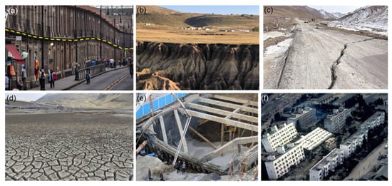 Geological hazards of different types of special soil: (a) foundation settlement of diatomite in Colombia; (b) gully erosion of residual soil in South Africa; (c) cracking of frozen soil foundation in the Tibet Plateau; (d) cracking of expansive soil in China; (e) foundation pit collapse of soft soil in China; (f) earthquake liquefaction of sand in Japan.