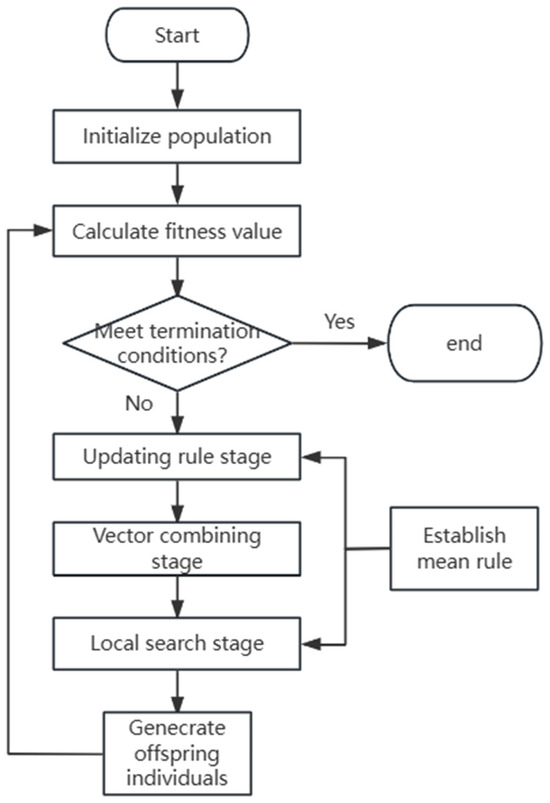 INFO is a new type of intelligent algorithm proposed by Dr. Ahmadianfar et al. in 2022. The algorithm applies the improved weighted mean idea to the entity structure and updates the solution vector through three core steps: updating the rules, combining the vectors, and performing a local search. The algorithm has characteristics of high speed and high accuracy and is simple, effective and robust. At the same time, it can effectively avoid the local optimal situation. Most importantly, it is a sufficiently novel and open-source algorithm to make it a suitable reference algorithm. The specific implementation process is described as follows (Figure 1 depicts the flow of the INFO).