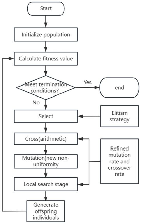 The GA has strong global search performance and high efficiency and robustness, but subsequent studies have also shown that the GA performs poorly in local searches, and the algorithm itself is prone to immature, slow convergence, degradation and other problems [20]. To address these problems, this paper improves the mutation operator, crossover, and mutation rate. The operations of the RGA are as follows (Figure 2 depicts the flow of the RGA).