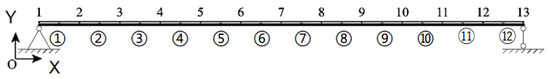 The model of the simply supported beam is shown in Figure 4. Its one section is fixed, and the bottom end of the other section is connected to a movable hinge support. The beam has an axial length of 1.2 m and is divided into 12 units, and the cross-section is a rectangle with a width of 0.05 m and a height of 0.015 m. The modulus of elasticity of the material is set to 2.061011 Pa, while Poisson’s ratio is 0.3, and the density is 7850 kg/m3. The first five orders of the nature frequencies of the model are 24.19 Hz, 96.66 Hz, 217.07 Hz, 384.76 Hz, and 598.42 Hz.