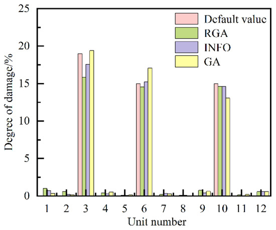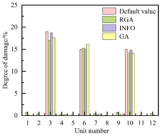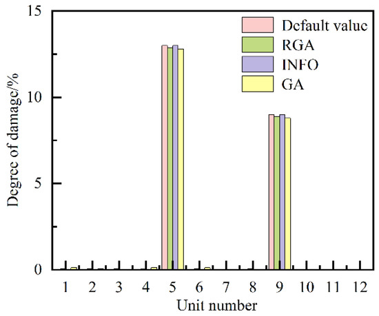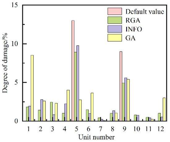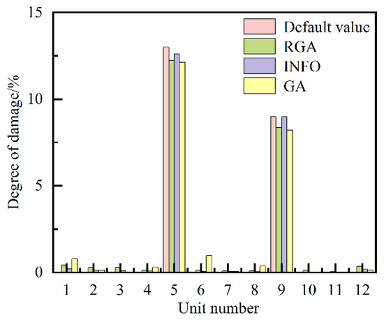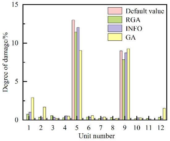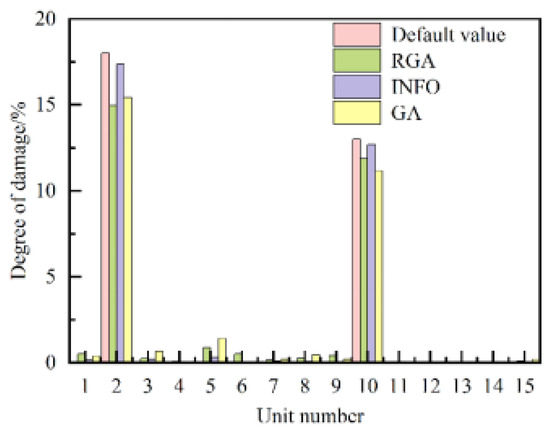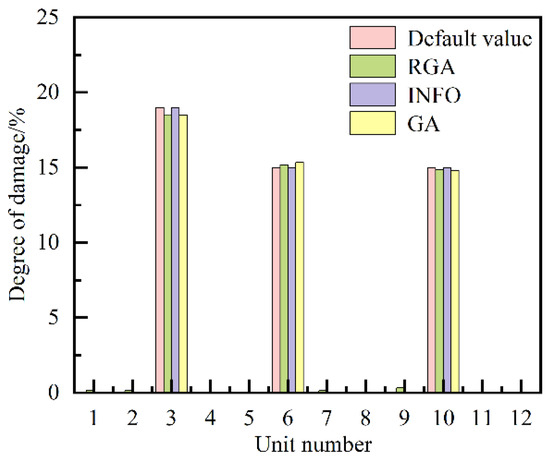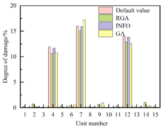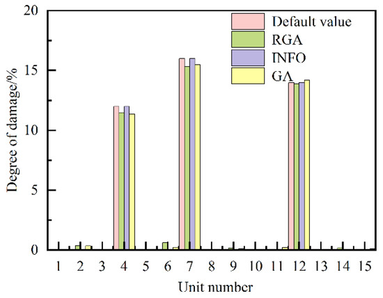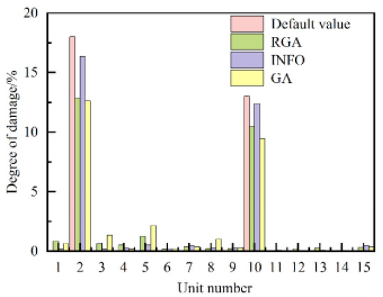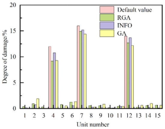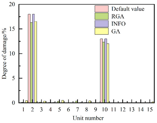 Table 8 (Case 3) shows that under the influence of 1%, 3%, and 10% noise, the mean errors of the target damage units identified by the GA are 14.18%, 28.64%, and 62.47%, 12.77%, 24.02%, and 52.34% by the RGA, and 2.90%, 6.80%, and 45.65% by INFO, respectively. It can be seen that INFO has the highest accuracy, the RGA has the second highest accuracy, and the GA has the lowest accuracy.