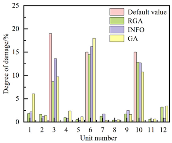 Further analysis of Table 2 shows that the mean errors of the target damage units identified by GA and RGA in Case 1 are 1.94% and 1.09%, while in Case 2, they are 2.02% and 1.60%, respectively, while INFO has the highest identification accuracy without obvious errors for the two cases.