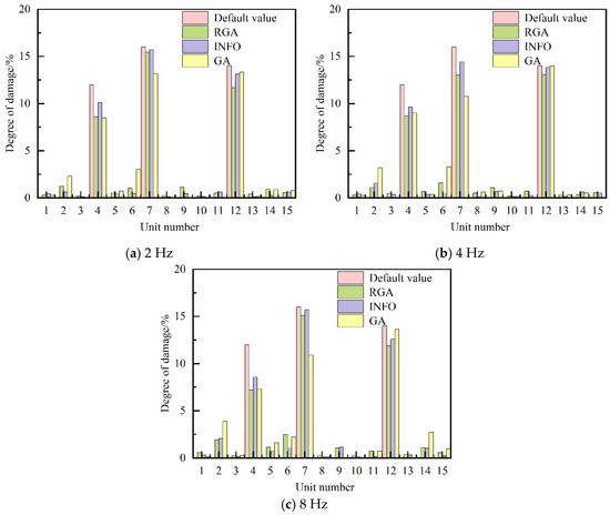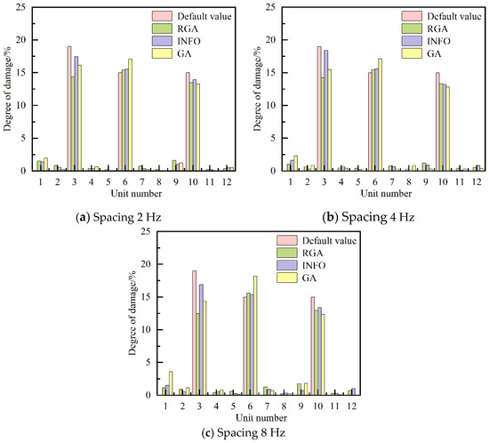 Table 10 shows that under the influence of the same noise, when equally spaced at 2 Hz, the mean errors of the target damage units identified for the GA, RGA, and INFO are 17.34%, 16.08%, and 7.95%, while they are 19.26%, 17.67%, and 10.31% when equally spaced at 4Hz, and 24.50%, 20.22%, and 13.55%, when equally spaced at 8Hz, respectively. It can be seen that the identification accuracy of the three algorithms becomes lower and lower with the gradual increase in taking-point spacing within the same frequency range. With the same taking-point spacing, INFO has the highest identification accuracy, RGA has the second highest identification accuracy, and GA has the worst identification accuracy.