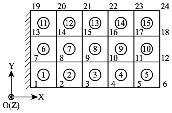 The cantilever plate model is shown in Figure 14, with its left end fixed. The length, width, and thickness of the cantilever plate are 0.5 m, 0.3 m, and 0.004 m, respectively; the density of the structural material is 7850 kg/m3; the modulus of elasticity is Pa; the Poisson ratio is 0.3; and it is divided into 15 plate-shell units, with the length and width of each unit being 0.1 m, and the left edge of the plate is fixed. The first five orders of its nature frequencies are 13.61 Hz, 50.21 Hz, 85.46 Hz, 167.02 Hz, and 236.78 Hz. The numbers above the nodes of the units are the node numbers, and the numbers inside the circles are the cell unit numbers.