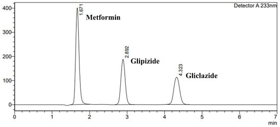 Chromatogram of ternary mixture of metformin 25 µg/mL:glipizide 25 µg/mL:gliclazide 25 µg/mL.