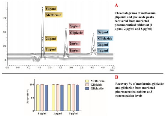 Recovery results for metformin, glipizide and gliclazide at three different concentrations (1 µg/mL, 2 µg/mL and 5 µg/mL). (A) represents chromatograms of recovered analytes from marketed pharmaceutical products and (B) represents recovery % of these analytes from marketed tablets at three different concentration levels (1 µg/mL, 2 µg/mL and 5 µg/mL). (*) in this image stands for the peaks of metformin, glipizide and gliclazide recovered from their marketed pharmaceutical products at different concentration levels and appearing at the same retention time for every analyte.