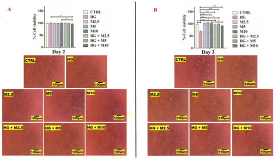 After 2 days of HEI-OC1 exposure to all treatments, all cells showed more than 96.5% (±2.52) viability. Cells exposed to 25 mM glucose (HG treated cells) showed slightly higher viability 99.75% (±1.71). All other treated cells showed cell viability ranging between 96.5% (±2.52) and 100.5% (±3). Neither the experimental day results nor the treatment type after 2 days of treatment were considered significant. The Bonferroni post hoc test revealed that only (HG versus HG + M10) and (M10 versus HG + M10) results were statistically significant, where the p value was <0.05 (Figure 6A).