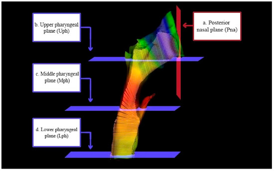 Four cross-sectional planes (one frontal and three axial sections) and four volume measurements of the pharyngeal airway were designed based on a previous study [6] (Figure 4).