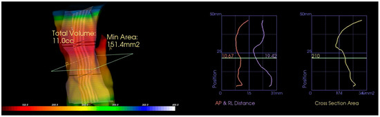 The CT scans were processed using the InVivo Dental software 6.0 to create volumetric renderings, followed by a volumetric analysis of the specified airways. The threshold values were fine-tuned to remove imaging artifacts and to enhance the delineation of the airway region. Subsequently, measurements of the airway volume, CSA, width, and height were recorded in cubic millimeters (mm3), cubic centimeters (cc), and millimeters (mm), respectively, Figure 5.