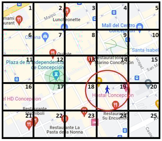 Figure 2 (where a red circle centered on the user intersects cells 13, 14, 18 and 19) and checks their cache for relevant data. For cells without cached data, they send a geocast requesting information. Users store all received data, implementing cache replacement policies as needed (detailed in
