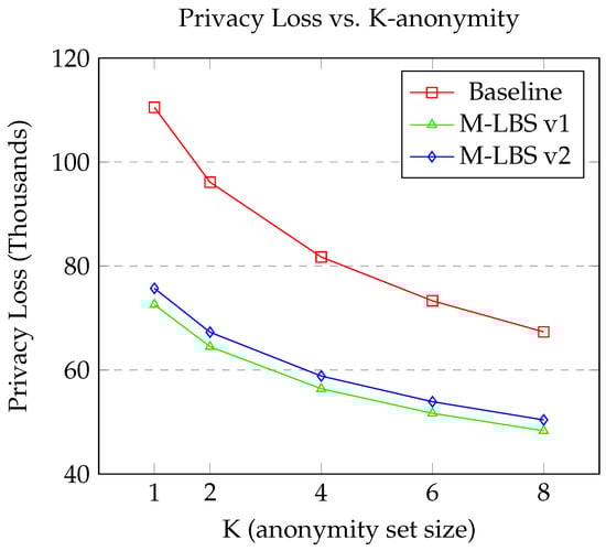 Similarly, the LBS server’s entropy before the query is . After receiving a query with k-anonymity, the LBS server learns that the user is within one of the k cells in the anonymity set, resulting in an approximate entropy of . The privacy loss for the LBS server is .
