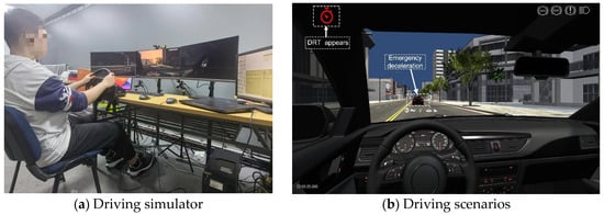 A 60 km two-way four-lane urban road was designed as a driving scenario to simulate typical real-world conditions. Each lane is 3.5 m wide. The road is surrounded by urban landscape. The vehicle was left-hand drive. Under manual driving, the vehicle was entirely under the driver’s control. Under automated driving, the vehicle was equipped with an L2-level ACC system that adjusted speed and direction to maintain a minimum distance from the preceding vehicle, with a maximum cruising speed of 60 km per hour. The driver was required to respond to emergency braking. The emergency braking task was selected for its high vigilance demand, unpredictability, and relevance to driving safety, providing an effective means to assess changes in driver vigilance across different driving modes [].