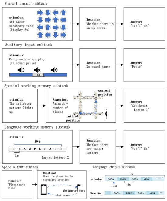 To induce additional workload during driving [], the experiment designated 9 subtasks derived from three resources: information input, working memory, and information output. The selection of these nine secondary tasks was based on the U.S. Department of Transportation National Highway Traffic Safety Administration’s classification of in-vehicle workload tasks and balanced cognitive load intensity. The contents of these subtasks are illustrated in Figure 2. To avoid the influence of learning effects on experimental results, the experiments were designed in a randomized manner.