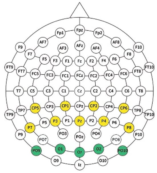 The Theta band (4–8 Hz) was chosen for its established role in working memory and attention []. The Alpha band (8–13 Hz), associated with relaxation, was analyzed to observe decreases in power during cognitive engagement []. The Low Beta band (13–17 Hz) was selected for its relevance to alertness, vigilance, and cognitive processing []. Fourteen electrode sites in the parietal and occipital electrodes (Figure 3) have been demonstrated to correlate with vigilance. Using fast Fourier transform (FFT), the power of Theta, Alpha, Low Beta, and the Theta/Alpha ratio were calculated for these 14 electrode points, yielding 56 EEG indicators.