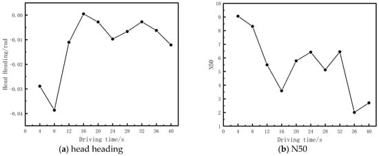 The cumulative effect changes in head heading and N50 are shown in Figure 4. After completing the 40 min following task in manual driving mode, the head heading changed by 25.89% and N50 decreased by 70.13%. Notably, the head heading increased significantly by 29.99% between 8 and 16 min and then stabilized within 10% after 16 min. N50 showed a significant decrease of 36.18% after 12 min, stabilized within 10% between 12 and 36 min, and decreased again by 47.22% after the 36 min mark.