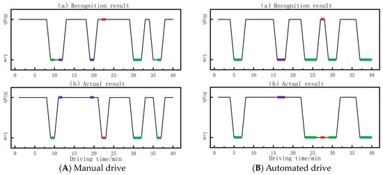 The recognition accuracy of the A-LSTM model for driver’s vigilance is 82.48% in manual drive and 87.13% in automated drive. The comparison between the model results and the DRT response results is shown in Figure 5. Green markers indicate that the model correctly identified the low-vigilance state, purple markers indicate false alarms for high-vigilance state, and red markers indicate missed alarms for low-vigilance state.