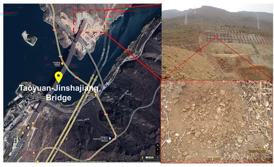 The soil–rock mixture used in the test was collected from the Taoyuan-Jinshajiang bridge site, located in Yunnan Province, China (Figure 1). Two representative sampling locations, along with their basic physical properties, are listed in Table 1. Geotechnical data indicate that the engineering geological strata of the deposit slope near the bridge site are relatively complex, and the uppermost stratum is composed of Quaternary avalanche deposit, predominantly consisting of soil–rock mixture. The soil is silty clay with a brown-red to brown-yellow color, exhibiting a hard plastic consistency. The rock blocks consist of moderately weathered limestone, primarily angular to sub-angular in shape, with a variable particle size distribution.