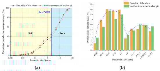(a) Grading curves and (b) particle size distribution histograms of soil–rock mixture from different sampling locations.