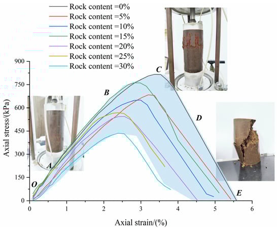 The uniaxial compression axial stress–strain curves for the seven groups of soil–rock mixture specimens with varying rock contents are shown in Figure 5. The results indicate that the curves exhibit a similar trend under varying rock content conditions, which can be divided into five distinct stages. In the initial stage of axial loading (OA stage), the axial stress shows a slightly upward concave trend at a small scale. The specimen then rapidly presents the linear elastic characteristics in AB stage until a stress drop occurs after reaching the peak compressive strength (as BC stage shown). During the CD and DE stages, the axial stress gradually decreases at a slower rate. The soil–rock mixture specimens exhibit various failure characteristics at different stages. In the OA and AB stages, no significant cracks were observed on the specimen surface, but localized fracture appeared once peak strength was reached (Figure 5). As the axial strain increased, cracks on the surface expanded rapidly until the main cracks penetrated (Figure 5).