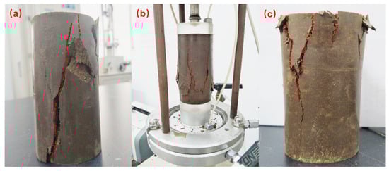 The specimens with varying rock contents exhibited varying failure modes, as illustrated in Figure 6. These failure modes can be categorized into three types: longitudinal fracture, shear fracture, and multiple shear fracture. The soil–rock mixture specimens with 0~15% rock content displayed a main crack that penetrated through the specimen (Figure 6a). As the rock content increased, the distribution of rock blocks within the specimens became more pronounced, resulting in a greater number of cracks that tended to become disorganized upon failure (Figure 6b). Under a rock content of 30%, the cracks on the surface primarily expanded around the rock blocks, leading to a multiple shear fracture without a prominent through crack, as shown in Figure 6c.