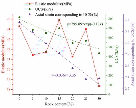 In accordance with the methodology for determining strength in the uniaxial compression test on rock, the peak strength of the axial stress–strain curve of soil–rock mixture is identified as the UCS value. The UCS values for soil–rock mixtures with varying rock contents, derived from computer numerical simulations, are presented in Table 6. The results demonstrate that as rock content increases from 0 to 30%, the UCS exhibits a rapid exponential decline, decreasing from 923.62 kPa to 407.67 kPa. Correspondingly, the axial strain at which UCS occurs also decreases, from 3.29% to 2.03%.