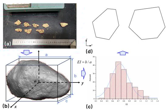 (a) Real rock blocks; (b) three-dimensional reconstruction; (c) distribution of EI of rock blocks; (d) base plane of irregular rock block models.