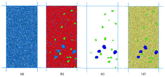 - The remaining particles, including the soil particles (yellow disk elements) and the irregular rock blocks (the green and blue clump elements),within the specimen are then re-cycled to achieve equilibrium, ensuring that the ratio of the average unbalanced force to the total contact force is less than 10–6 through the application of the wall servo command. Ultimately, the soil–rock mixture meso-structure model is generated, incorporating the irregular rock block models based on the actual shape of the rock blocks, as depicted in Figure 9d.