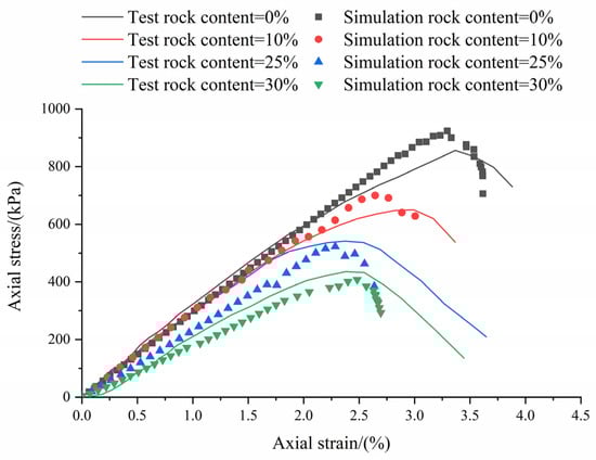 During the simulation process, the walls on both sides of the model were first removed, transitioning the simulation condition to uniaxial compression. The axial loading speed of the wall was then set to 0.005 m/s, and the uniaxial compression simulation test of soil–rock mixture was performed. The test was terminated when the post-peak axial stress dropped to 0.7 times the peak strength. The simulation results of soil–rock mixture with varying rock contents are presented in Figure 10. The results demonstrate that, for the same rock content and specimen size, the axial stress–strain curves obtained from the simulations closely resemble experimental results, exhibiting a clear linear increase followed by strain-softening behavior. Despite some discrepancies between the simulation and experimental results (such as the strain corresponding to the peak strength), the relative error values of the UCS are within 10%. This suggests that the meso-structure model of soil–rock mixture with irregular rock blocks generated in this study can more accurately reflect the real structure and mechanical characteristics of the soil–rock mixture.