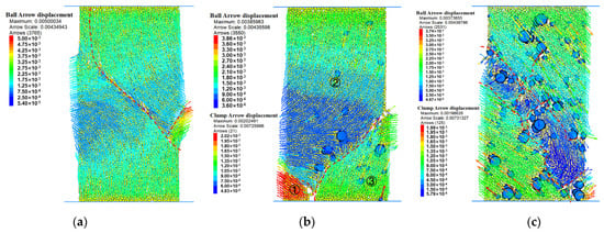 Displacement vector diagram of soil–rock mixtures with rock content of (a) 0%, (b) 5%, and (c) 30% at the failure state.
