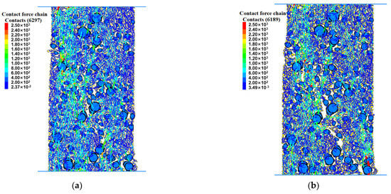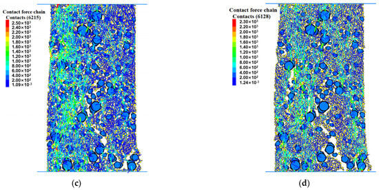 Figure 12 shows the force chain distribution contours of soil–rock mixture models at the failure state with varying friction coefficients of soil–rock contacts. The results reveal that when the friction coefficient of soil–rock interfaces is high, the soil matrix, rock blocks, and interface collectively enhance the ability of the material to resist external deformation. The thickness of the internal force chains is relatively uniform and predominantly concentrated in the soil–rock contact areas. As the friction coefficient decreases, the strength provided by the soil–rock interface also diminishes, resulting in the force chain becoming predominantly concentrated in the middle and lower parts of the left side of the model. In comparison to the strong chain observed at the soil–rock interface in Figure 12a, the strong chains depicted in Figure 12c,d are predominantly located within the soil matrix. Furthermore, the uneven distribution of internal force chains within the soil–rock mixture becomes increasingly pronounced, resulting in a heightened probability of contact fractures at the weaker soil–rock interface.