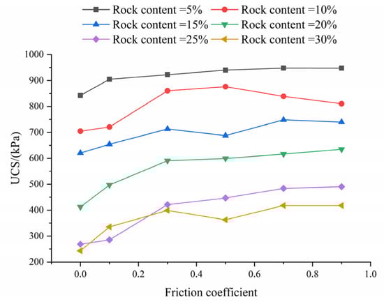The discussions above show that underlying cause of the decrease in strength of soil–rock mixture triggered by an increase in rock content is the emergence of weak-strength soil–rock contact surfaces. Figure 13 illustrates the variation in UCS of soil–rock mixture models with varying rock contents under various friction coefficients of soil–rock contact. The results indicate that the UCS consistently declines as the friction coefficient decreases under different rock content conditions. Additionally, the sensitivity of UCS to variations in the friction coefficient varies significantly with different rock contents. Under conditions of low rock content (5%), the UCS decreases from 947.56 to 842.43 kPa, representing a reduction of 11.09% as the interface friction coefficient decreases from 0.9 to 0. Conversely, at the rock content of 30%, the UCS decreases from 417.63 kPa to 243.37 kPa, reflecting a substantial reduction of 41.73% as the friction coefficient decreases.