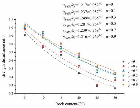 The variation trends of UCS indicate that both rock content and soil–rock interface strength significantly influence UCS. From the perspective of material stiffness, the increase in rock content facilitates a gradual transition in the mechanical properties of soil–rock mixture from those of soil to those of a jointed rock mass, resulting in enhanced material stiffness. To quantitatively assess the influence of rock content and soil–rock interface strength on UCS, this paper discusses the disturbance effect of rock content by considering how rock blocks damage the initial structure of the soil matrix. The strength disturbance ratio (σS-RM/σc) is defined as the ratio of UCS between the soil–rock mixture and the soil matrix. Figure 14 presents the variation in the strength disturbance ratio of UCS with rock content of soil–rock mixture under varying friction coefficients. An exponential function of the form y = A × Bx was used to fit the UCS variation, and the resulting estimated formulae for UCS of soil–rock mixture are shown in Figure 14.
