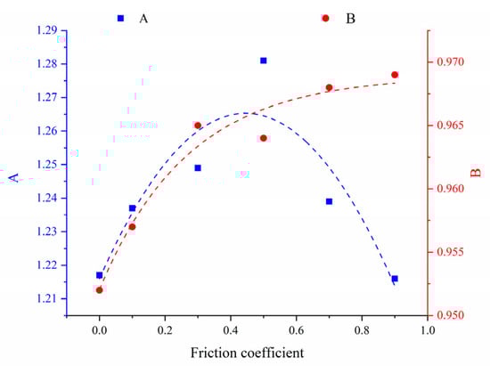 Figure 15 presents the relationship curves between the parameter A and B in the estimation formula and the friction coefficient of the interface. The results reveal clear functional relationships between these undetermined parameters and friction coefficient, as follows: