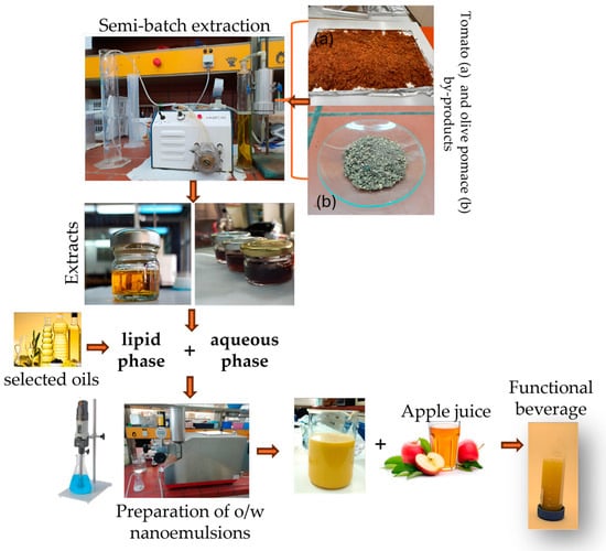 Flow diagram of the overall process (from semi-batch solid/liquid extraction to production of the beverage), showing also the raw materials (tomato and olive pomace by-products) and extracts used to produce o/w nanoemulsions and the final functional beverage.