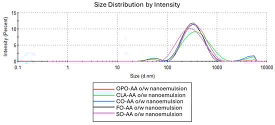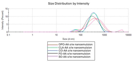Typical droplet-distribution graph based on intensity for olive pomace oil (OPO), canola oil (CLA), corn oil (CO), fish oil (FO), and sunflower oil (SO) nanoemulsions enriched with lycopene and ascorbic acid (AA) after the homogenization process.