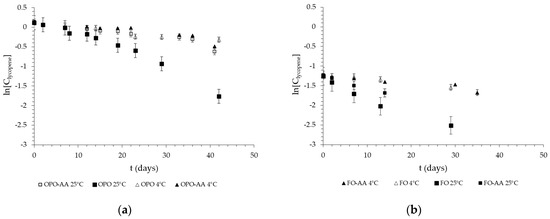 Deterioration of lycopene concentrations in (a) olive pomace oil (OPO) and (b) fish oil (FO) o/w nanoemulsions with or without the addition of ascorbic acid (AA) during storage at 25 °C and 4 °C and pH = 2.