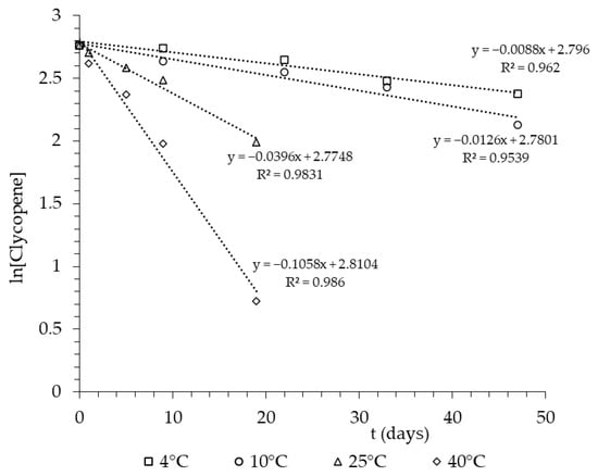 Deterioration of lycopene concentrations in the functional beverage during storage as a function of temperature (4, 10, 25, and 40 °C).