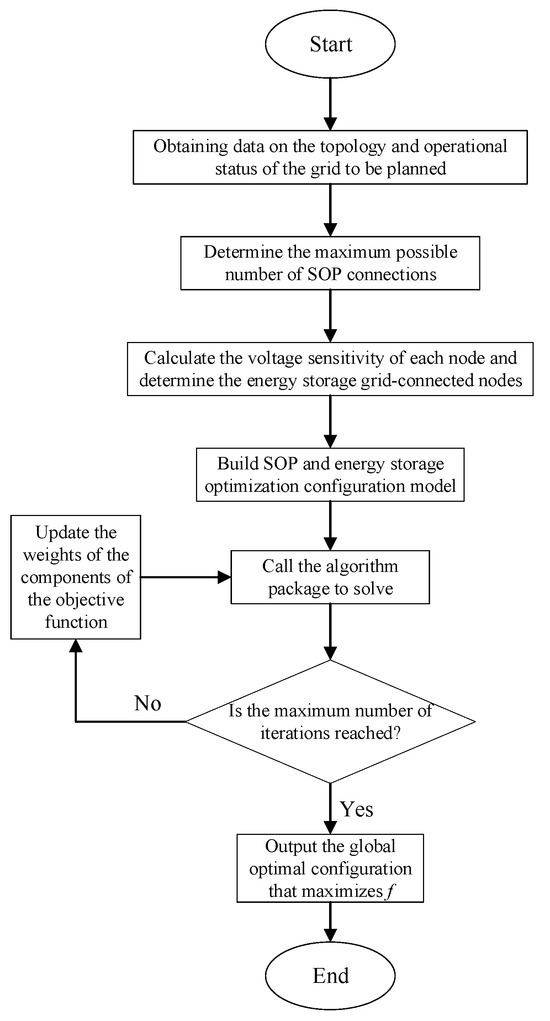 The flowchart of the SOP and energy storage optimization configuration method in a snowflake-shaped grid proposed in this article is presented in Figure 3. Firstly, data must be obtained on the topology and operational status of the planned power grid. Secondly, the maximum possible number of SOP-connected nodes between power grid stations is determined based on the snowflake-shaped grid structure. The energy storage connection nodes are then determined according to the calculation results of the voltage sensitivity of each node. Thirdly, an SOP and energy storage optimization configuration model must be constructed. Finally, call the algorithm package to solve and output the global optimal configuration that maximizes the objective function proposed in Section 4.