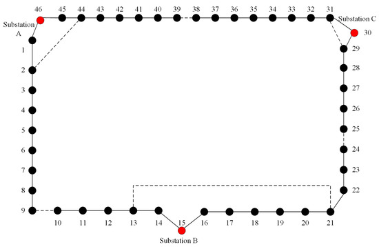 The schematic diagram of the four-station snowflake-shaped grid is presented in Figure 1. The snowflake-shaped grid comprises four inter-station contact points and four intra-station contact points. The inter-station contact points are defined as key nodes, marked with red dots. The internal contact points are defined as secondary key nodes, marked with green dots. The other ring network nodes are defined as general nodes, which together with the 10 kV lines form the edges of the snowflake-shaped grid.