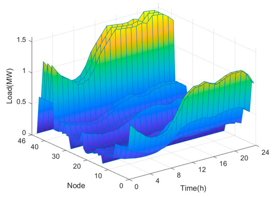 This article employs a snowflake-shaped grid in Tianjin as an example to verify the effectiveness of the proposed SOP and energy storage optimization configuration method. The system structure is illustrated in Figure 4. The system operates at a rated voltage of 12.66 kV, and the typical daily load curve is illustrated in Figure 5. The branch impedance parameters are presented in Table 1.