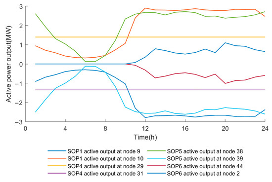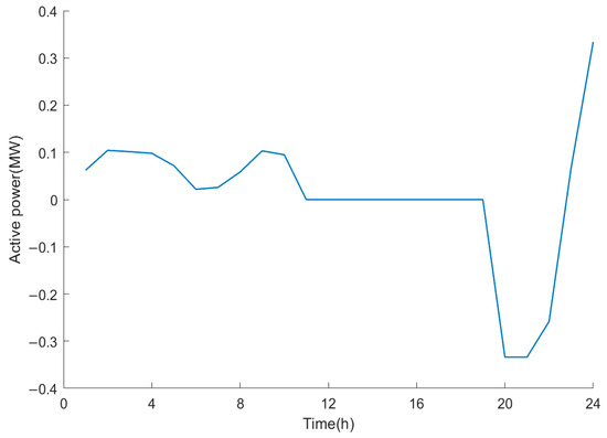 In light of the aforementioned planning results, an analysis should be conducted to ascertain the extent to which SOP and energy storage optimize the operation of the snowflake-shaped grid when connected with the optimal configuration scheme. Figure 7 and Figure 8 illustrate the timing curves for the active and reactive power output of the SOP, respectively. Figure 9 illustrates the charging and discharging curves of the energy storage system at access node 40. As illustrated in the figure, SOP facilitates the transmission of the active power flow and provides reactive power compensation within the power grid, whereas energy storage optimizes the load distribution between feeders through the process of charging and discharging at different times.