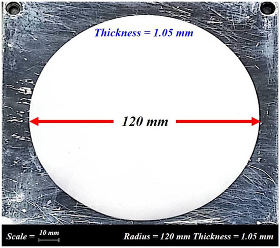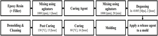 The test specimens were epoxy/Al2O3 micro-composites with approximately 20 vol% Al2O3 micro-particles embedded in an epoxy matrix based on the manufacturing procedure of Figure 1. In case of epoxy composite, the properties of the composites would vary depending on the content ratio of the filler added [25,26]. For example, a decreasing trend in the insulation BDS was observed in epoxy resins containing micro-sized Al2O3 fillers beyond a loading of 40 wt% [26]. In addition, Ref. [27] reported that the mechanical properties, such as tensile strength and bending strength, decreased when Al2O3 micro-fillers were added at amounts exceeding 40 wt%. In this research, a 20 vol% content ratio of Al2O3 filler was considered based on the fact that optimized performance improvement was obtained at 40 wt% in such studies. It is worth noting that a filler loading of 40 wt% approximately corresponds to 20 vol% considering the densities and weight ratios of epoxy resin, curing agent, and micro-sized Al2O3 fillers.